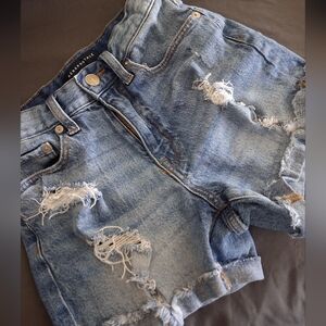 Trendy ripped jean shorts by Aeropostale. Light blue denim with a casual vibe. Perfect for everyday wear.