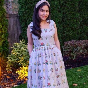 Herbarium print, gridded garden print floral dress with smocked back, side zipper, and tie shoulder straps.