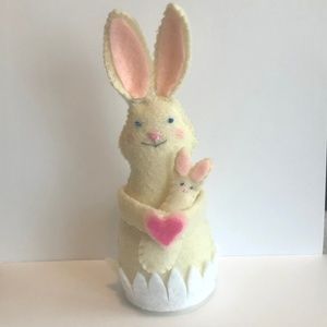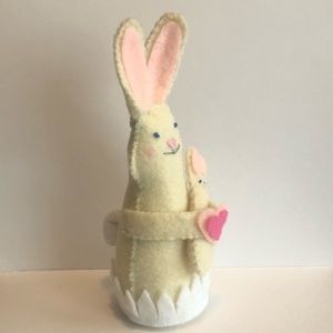 She's made of cream felt with light pink ears, a two-tone pink heart in her hands, and white grass, holding a cute felt miniature baby bunny. (Check listings; other variants available!)