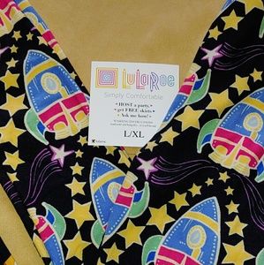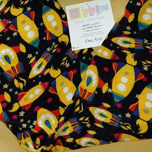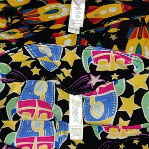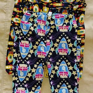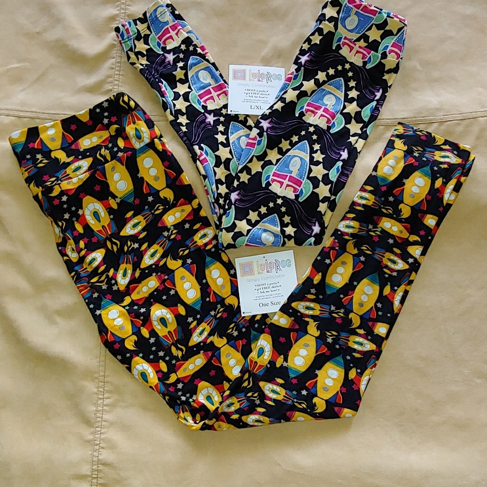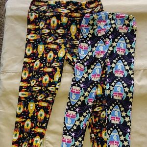 One Size yellow rocketship leggings & kids L/XL baby blue rocketship leggings. Kids have been worn and have piling on knees. idk if the OS was ever worn because they show no signs of wear. This is a great Mothet & Son pair.