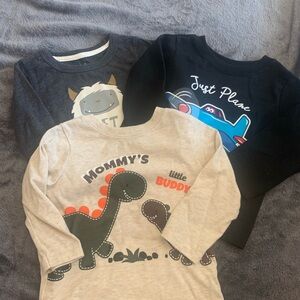 Adorable kids' long sleeve t-shirt featuring a charming dinosaur design with 'Mommy's Little Buddy' text. The soft gray shirt showcases a playful dark gray dinosaur graphic with orange accents, perfect for your little one's casual wardrobe. Lot of 3 long sleeve size 12 month shirts.