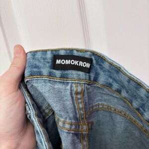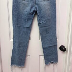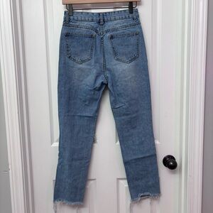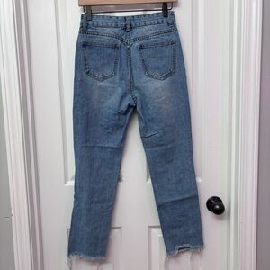Elevate your casual style with these classic blue distressed straight leg jeans. Perfect for everyday wear, offering both comfort and a trendy look. High-waisted, straight-leg, distressed light blue denim jeans with a raw hem.