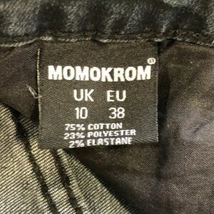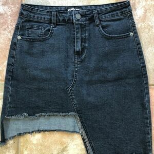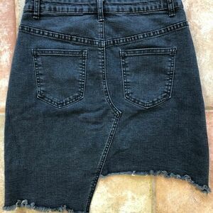 Brand: Momokrom Type: Denim Jean Skirt Style: Asymmetrical Caster Size: 10 UK = Medium USA Condition: Nice Clean - Preowned Color: Black - Medium Wash Material: 75% Cotton, 23% Polyester, 1% Elastane Description: frayed hem. Measurements: Waist un-stretched: 13.5" Waist to bottom longest: 17" excluding fray Waist to bottom shortest: 14"
