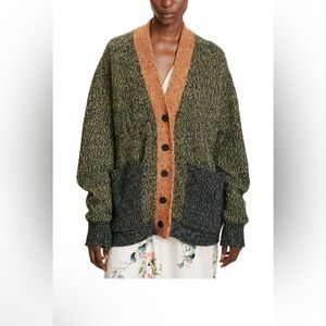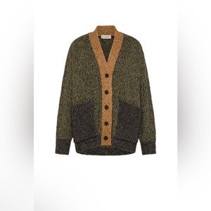 Front buttoned closure, logo at the back label, regular length, long-sleeved, v-neck, cuffed sleeves.
