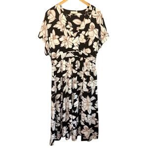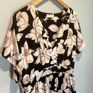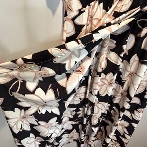 Pretty bold floral print in tan and cream on a black background. Short sleeves. Surplice neckline. Cross over style skirt. Hidden zip up the left side.