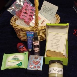 Foot works, mineral face mask, exfolliant Love Soap, makeup removal, hand cream and wash.. And for the Hot Mom.. A Hot Apple Candle and some heart chocolates