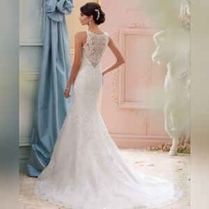 Athena Lace back, sleeveless corded lace appliqué and tulle over satin fit and flare dress features a uniquely scalloped lace and illusion modified bateau neckline with hand-beaded detail accented with Swarovski crystals over a plunging sweetheart bodice, illusion and lace low deep curved back bodice with beaded accents features covered button closures, scalloped hemline and chapel length train.