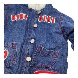 This Mon Petit denim jacket for baby girls size 24M offers a stylish combination of comfort and warmth. Featuring a cozy faux fur hood and charming heart patch, its durable design ensures long-lasting wear. The jacket's classic button closure and embroidered 'Baby Girl' detail highlight its appeal for cooler days.