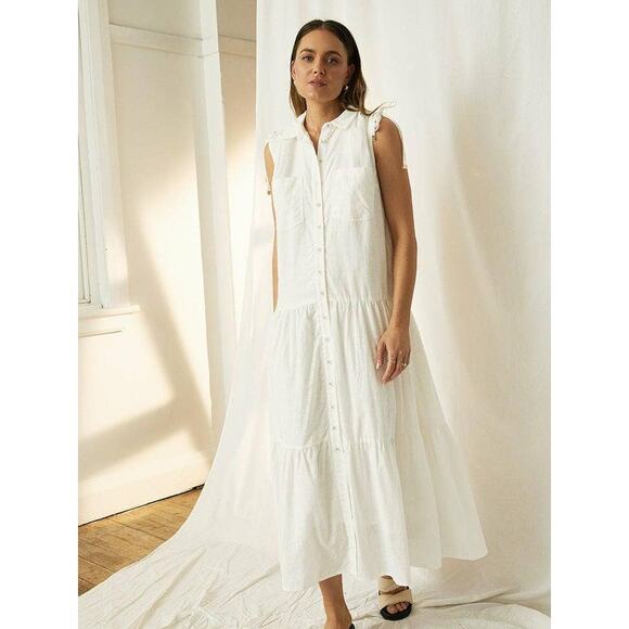 A pointed collar frames this midi dress with a sleeveless cut offers a sleek, refined style to any look.