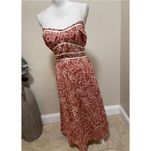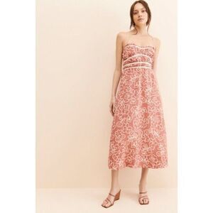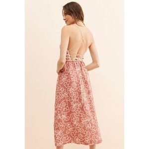 Floral sundress in midi silhouette w/ strappy back and ruffled neckline