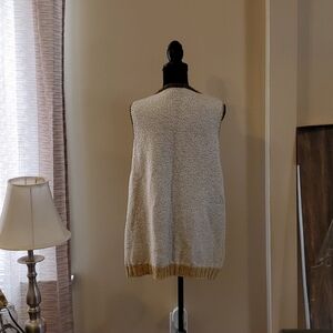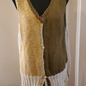 Delightfully quirky sweater vest features three different buttons. Color scheme consists of olive, yellow, and beige.