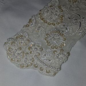 long laced sleeve with embellishments and pearls