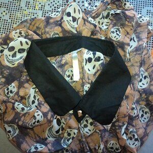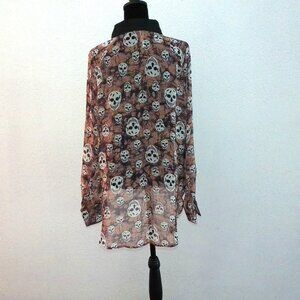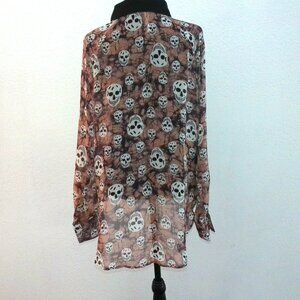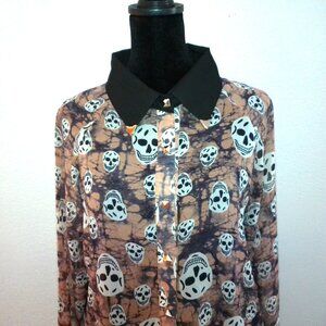 Mona B, Beige skull pattern blouse, with metal studs for buttons, good for Halloween