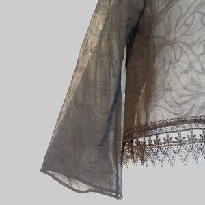 This ethereal dark sheer smoke pattern blouse features flowing bell sleeves and intricate lace trim, evoking a romantic and free-spirited bohemian vibe. The delicate fabric and elegant details make it a versatile piece perfect for layering or adding a touch of allure to any ensemble