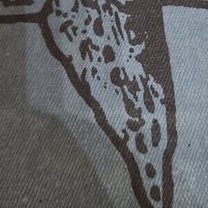Known for repurposing fabrics, mostly from parachutes and military equipment like leather straps, tarps and tents, the Mona B wallet / wristy was bought on Cape Cod. Screen printed Starfish in on a blue-ish gray canvas and had leather trim.