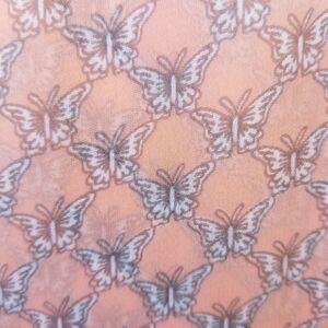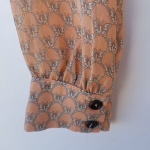 Mona B blouse with tie. Perfect for work. Approximate measurements are pit to pit 19". Sleeves are approximately 25". Length is approximately 23". Semi sheer. Very lightweight very good condition. I marked orange, but is a light peach color. Lots of mini butterflies on fabric
