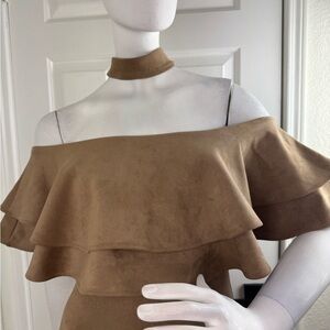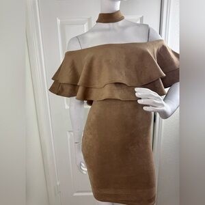 Step out in style with this elegant off-shoulder tan dress. Perfect for any occasion, this dress features a chic layered design that adds a touch of sophistication to your look.