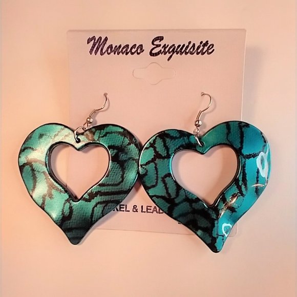 NWT: Monaco Exquisite Acrylic Turquoise Blue and Black Heart Snake Print Dangle Drop Earrings