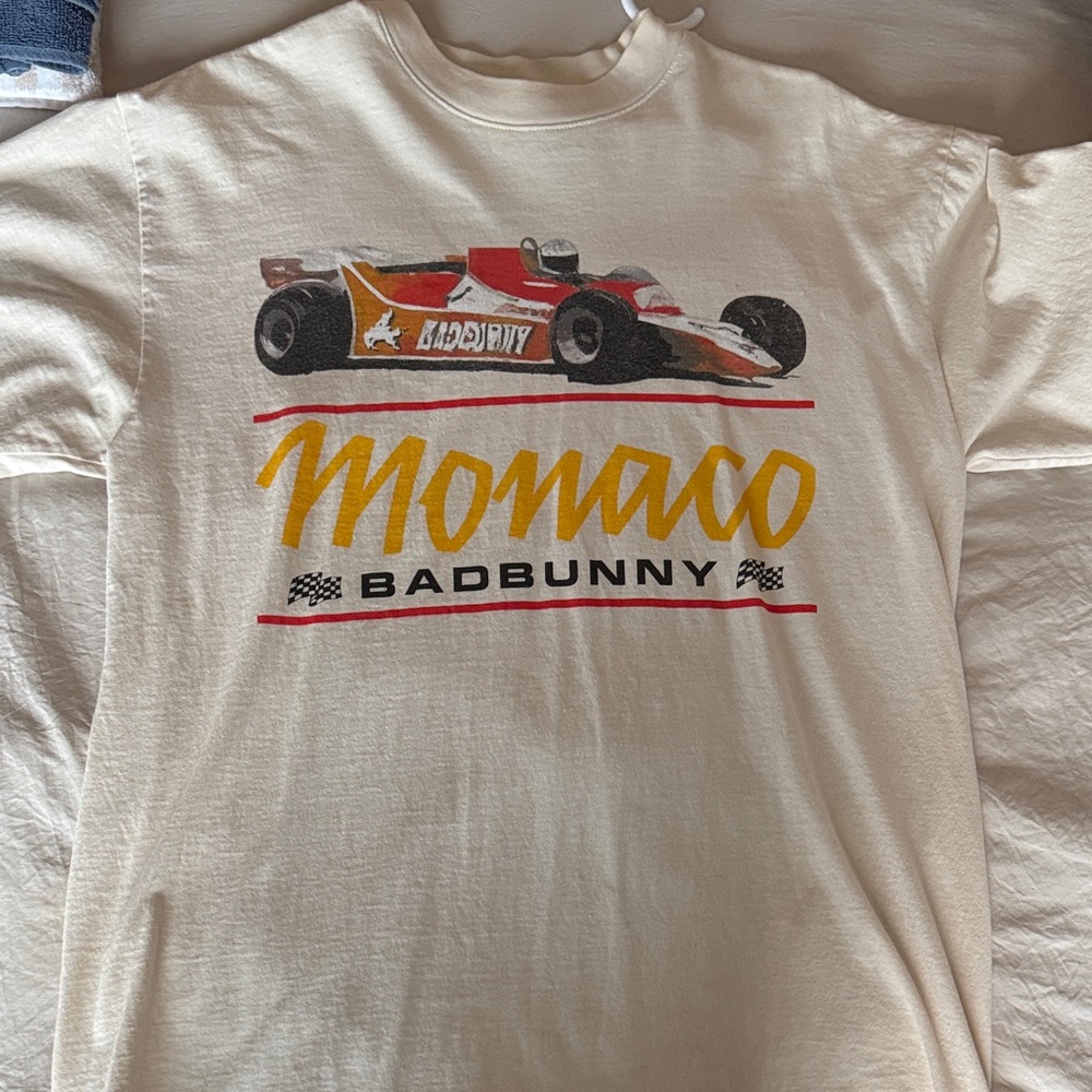 Cream tee with Monaco racing car graphic. Features bold red and yellow accents.