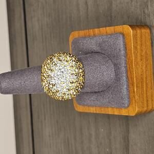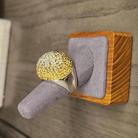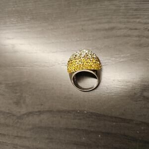 The dome of this rhodium silver ring is encrusted with pave Austrian crystals arranged in ombre shades from clear to canary to golden topaz. Size 9. Originally $130.