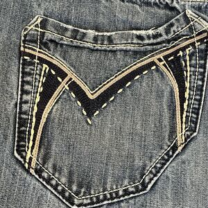 Monarchy Jeans Y2K Mens Size 40 Blue Distressed BootCut Jeans Embroidered Pocket