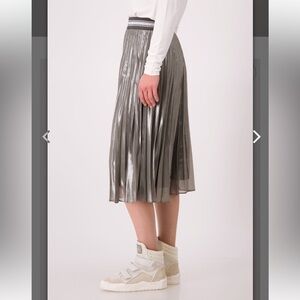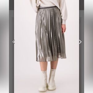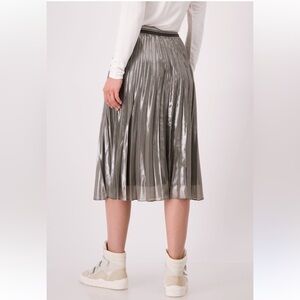 The Monari Skirt Midi Pleated Thunder is a mid-length pull on skirt with flat elastic waistband in metallic silver.