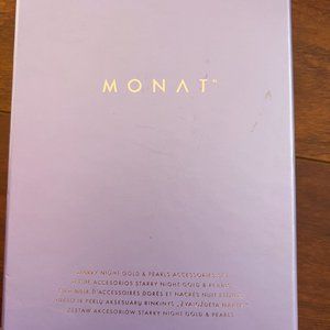 NEW IN BOX: Monat hair accessories set. This is a really pretty set that includes 1 gold barrette, 1 gold cuff ponytail holder, 1 pearl and rhinestone hair clip, and 1 set of embellished bobby-pins (2 pearl, 2 star rhinestone, and 1 gold moon).
