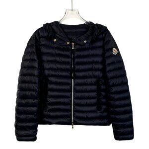 Crafted by Moncler, this black down puffer jacket offers warmth and style. The hood provides additional coverage, making it suitable for chilly weather.