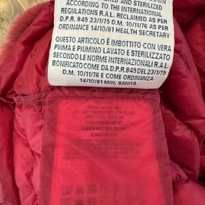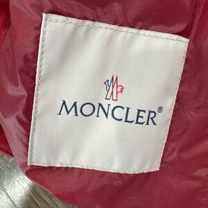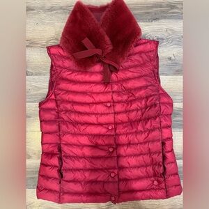 Elegant burgundy puffer vest by Moncler. Features a plush collar and button closure. Excellent condition with fox fur removable collar