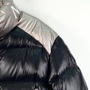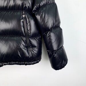 Black stand-collar zip-up long-sleeve down jacket with signature logo detailing.