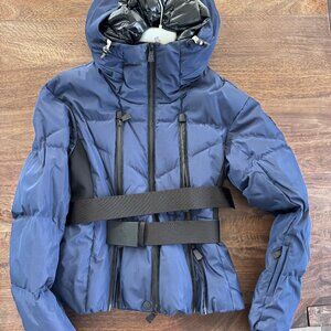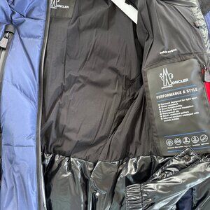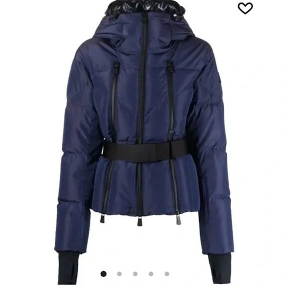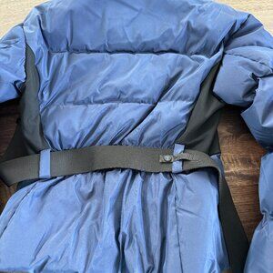 Self: 100% polyFilling: 90% goose down, 10% feathers. Made in Romania. Hand wash. Front double zip closure with optional buckle belt. Double hood with drawstring fastening. Front zip vents. Contrast cuffs with thumbhole detail. Logo and zip detail at sleeveWind-resistant gaiters.