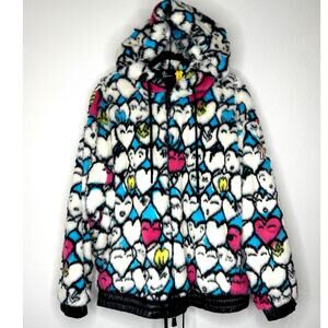 Moncler Grenoble White Heart Print Faux Fur Fuzzy Oversized Hoodie Jacket Large