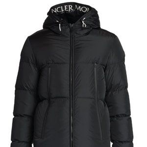 The entire zipper edge and hood has a continuous, embroidered "MONCLER" branded panel. The jacket is paneled nylon with Moncler's signature high quality, warm down filling. The front pockets extend almost fully across the front of the jacket. The sleeves are long with elasticized cuffs. The jacket also has a shiny nylon interior and a classic arm black logo panel. Color of the jacket is black matte.