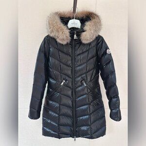 Black, down-filled, glossy design, padded design, logo appliqué on the chest, classic hood, patch pocket on the chest, long sleeves, and concealed closure on the front.
