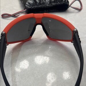 Unisex wrap around orange & black Moncler sunglasses. Brand new with black shiny puffer case, lens cloth, product info.
