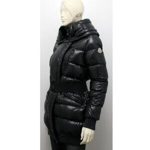 Moncler Puffer Down Jacket Hooded Belted Winter Coat black glossy shiny