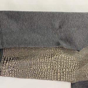 Moncler pullover sweatshirt top. Metallic embossed faux alligator on front. Gray sweatshirt material makes up the rest. Crew neck.