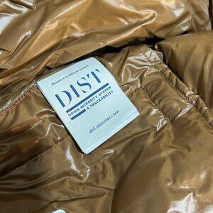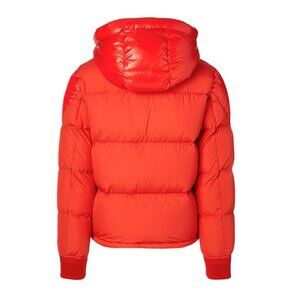 Long sleeve down-filled quilted nylon poplin jacket in red. Tonal nylon satin trim throughout. Bungee-style drawstrings at hood and hem. Flap pocket at chest. Felted logo patch at upper sleeve. Two-way zip closure at front. Zippered welt pockets at waist. Rib knit cuffs. Nylon satin lining in brown. Corduroy lining in brown at hood. Silver-tone hardware.