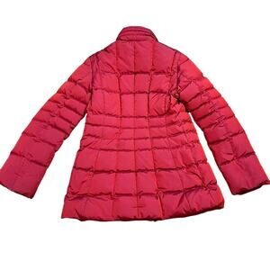 Stylish red quilted jacket. Features a full zip closure. Lightweight and warm.