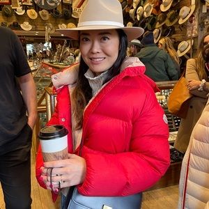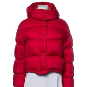 Stylish Moncler puffer jacket. Vibrant red color. Perfect for cold weather.