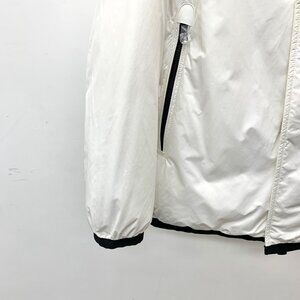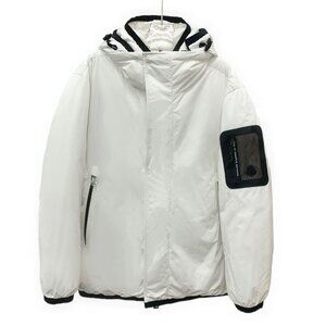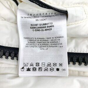 Moncler Richet white down jacket featuring a hood, front zip closure, and logo detailing. Warm and lightweight design suitable for cold weather.