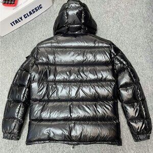 Sleek and insulated puffer by Moncler. Features a glossy black finish. Ideal for cold weather.