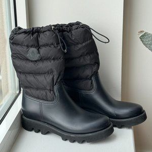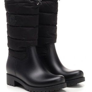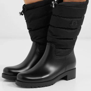 Black Ginette padded boots from MONCLER featuring padded panels, almond toe, drawstring fastening, calf-length and ridged rubber sole.