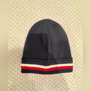Moncler navy wool beanie with red and white stripes. 100% wool. Made in Italy. Very good condition. No stains or tears