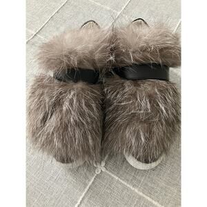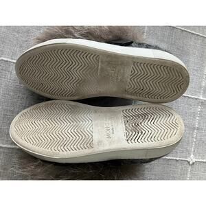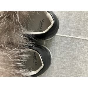Beautiful dark gray felt uppers with huge fluffy gray fox for trim overlay. White soles and white lining. Made in Italy by Moncler. Excellent condition, worn maybe three times. Size 38