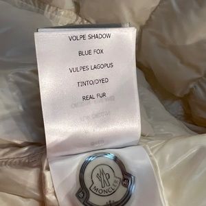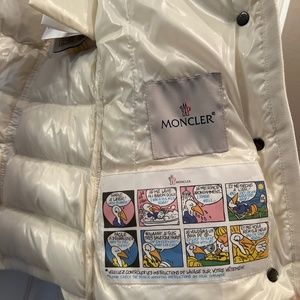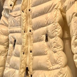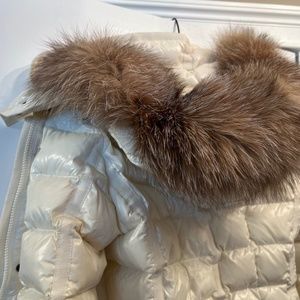Elegant white puffer jacket. Features luxurious fur-trimmed hood. Stylish and warm.