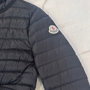 Elegant black puffer jacket by Moncler. Features a quilted design and hood. Ideal for cold weather.