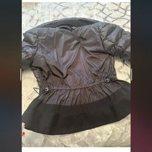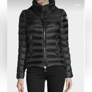 Elegant black puffer with a sleek design. Features a front zip and side pockets. Ideal for cold weather.