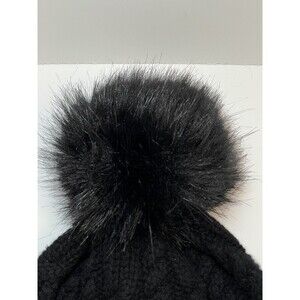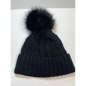Designer Deanne made of Cable knit virgin wool and cashmere blend beanie and black faux fur pom-pom at crown with felted logo patch at rolled brim.