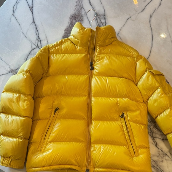 Bright yellow puffer jacket. Features zip closure and side pockets. High collar for added warmth.